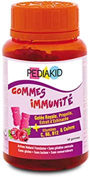 Complemento alimenticio en forma de gominolas a base de Jalea Real, extracto de Equinácia, Propóleos, Vitaminas y Cobre. Las Gominolas Inmunidad de PEDIAKID® reúnen activos naturales rigurosamente seleccionados para unas propiedades reconocidas y su acción suave permitiendo mantener las defensas del organismo. Recomendados para los cambios de estación, periodos propicios a resfriados, se elaboran a partir de un complejo de Jalea Real, extracto de Equinácea, extracto de Propóleos, vitaminas y minerales para, por una parte contribuir al funcionamiento normal del sistema inmunitario (extracto de Equinácea, Vitaminas C, B6, B12, Cobre) y por otra para mantener las defensas del organismo (extracto de Equinácea). Las Gominolas Inmunidad de PEDIAKID® no contienen gelatina, sin conservantes, sin gluten, sin lactosa, sin aromatizantes ni colorantes artificiales. Una fórmula práctica, lúdica y sana, ¡ideal para los niños! A base de pectina de manzana, con delicioso aroma natural de Frambuesa. Bote de 60 ositos