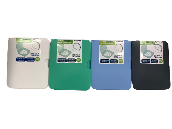 Estuche porta mascarilla. Apto para múltiples mascarillas. Fácil limpieza y desinfección. Con ranura de ventilación. Incluye correa para colgar. Disponible en 4 colores
