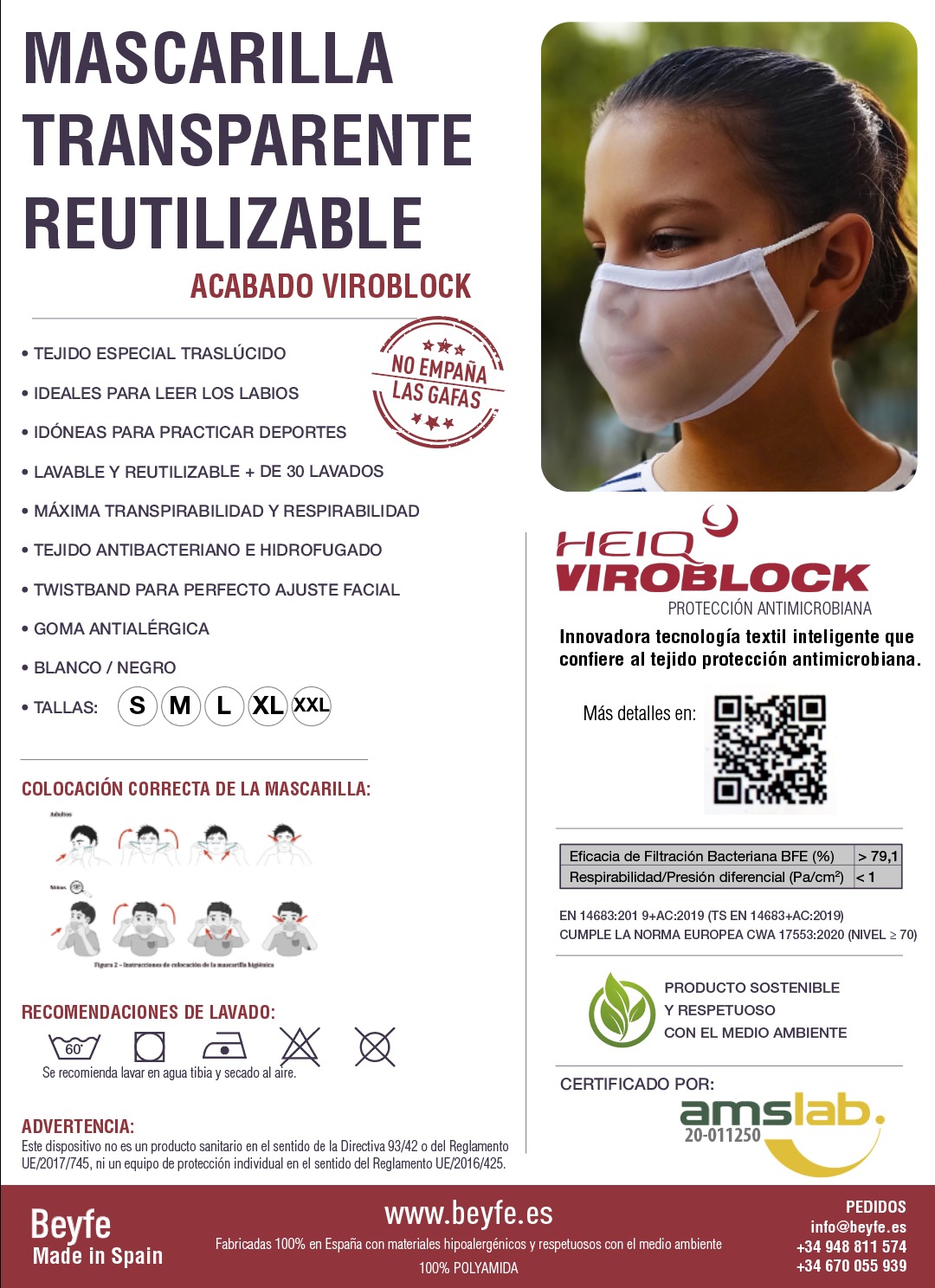 Mascarilla textil transparente con Innovadora tecnología textil inteligente que confiere al tejido protección antimicrobiana. El HeiQ Viroblock NPJ03 se agrega a la tela durante la etapa final del proceso de fabricación textil. HeiQ utiliza una tecnología de plata avanzada y una tecnología de refuerzo de vesículas, diseñada para inhibir el crecimiento de microorganismos en superficies textiles. ESPECIFICACIONES: