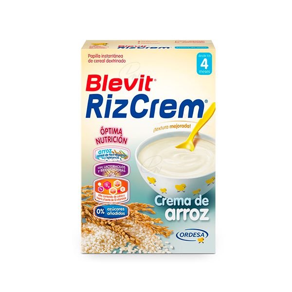Harina de cereal dextrinado 93% (Arroz), Dextrinomaltosa, Sales minerales (calcio, hierro), Complejo vitamínico (Vitaminas: C, Nicotinamida, E, Pantotenato cálcico, B6, B2, B1, A, Ácido fólico, K, Biotina, D, B12), Aroma, probióticos (Bifidobacterium infantis y lactobacillus rhamnosus).