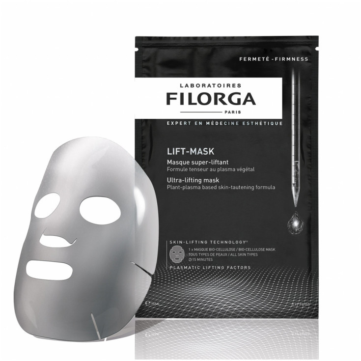 Mascarilla facial de Filorga efecto lifting con una formúla tensora con plasma vegetal. Modo de empleo: Abrir la bolsita y desplegar la mascarilla. Retirar delicadamente la malla protectora para exponer una cara gelificada y colocarla sobre el rostro limpiado previamente. Retirar la segunda capa protectora. Dejar actuar 15 minutos. Retirar la mascarilla y hacer penetrar el exceso de producto masajeando mediante movimientos ascendentes en el escote, el cuello y el rostro. Aplicar tres veces por semana. No es necesario enjuagar.