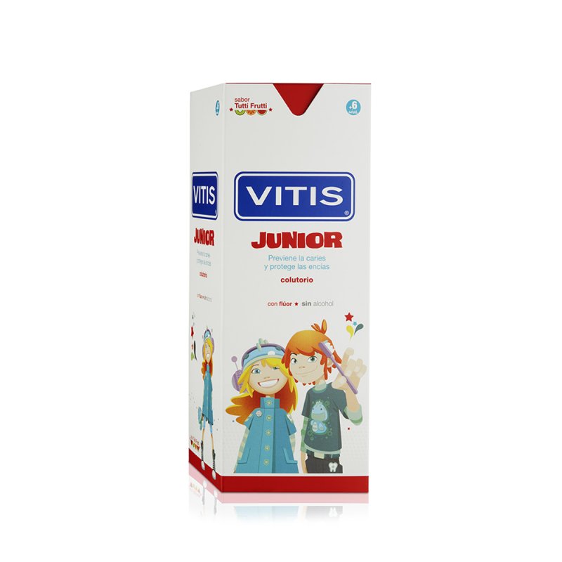 VITIS® Junior colutorio está especialmente indicado para la prevención de la caries y cuidado de las encías en la higiene bucal diaria en niños mayores de 6 años. A partir de los 6 años, los niños suelen tener desarrollado el control del reflejo de deglución, por lo que se recomienda introducir el uso del colutorio a esta edad para completar la higiene bucal diaria. El colutorio VITIS® Junior formulado con flúor, pantenol y xylitol, ofrece un cuidado completo de dientes y encías. El flúor remineraliza el esmalte previniendo así la formación de caries y el pantenol protege y cuida las encías en esta edad en la que erupcionan los dientes definitivos.