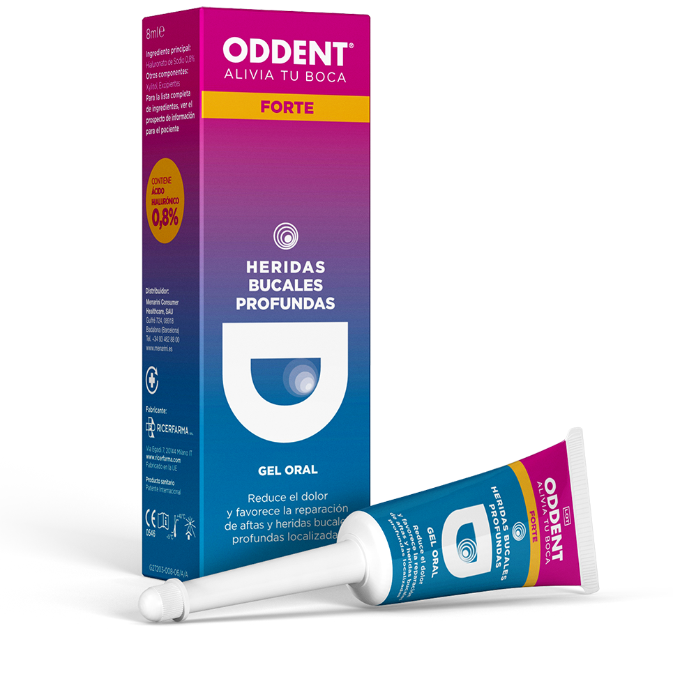 ODDENT® Gel Forte, la solución más Forte para el alivio de tu boca, con más concentración de ácido hialurónico (0,8%). Reduce el dolor y el malestar desde las primeras aplicaciones. Formulado especialmente para usarlo durante la fase postoperatoria o después de traumatismos, intervenciones quirúrgicas o periodontales