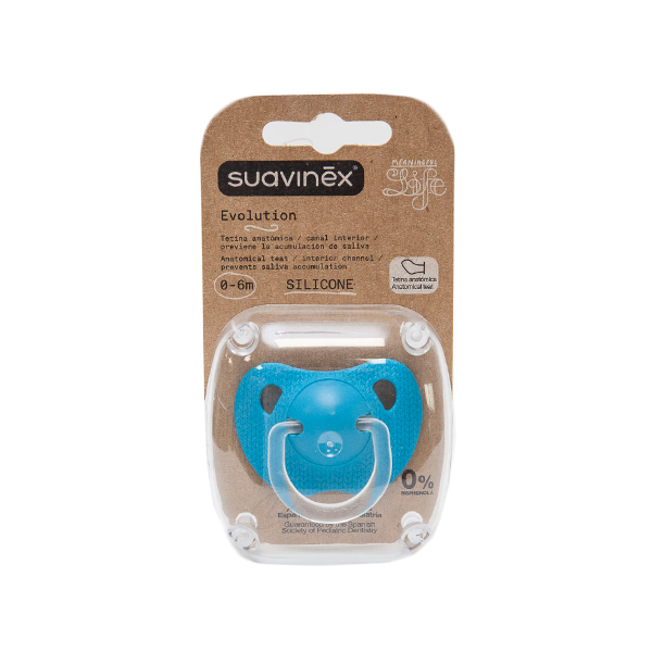 El chupete imita la forma del pezón durante el proceso de succión y se adapta perfectamente a la boca del bebé. Previene la acumulación de saliva, al tiempo que facilita la adopción de la correcta posición de la boca al succionar. Favorece el correcto desarrollo del paladar.